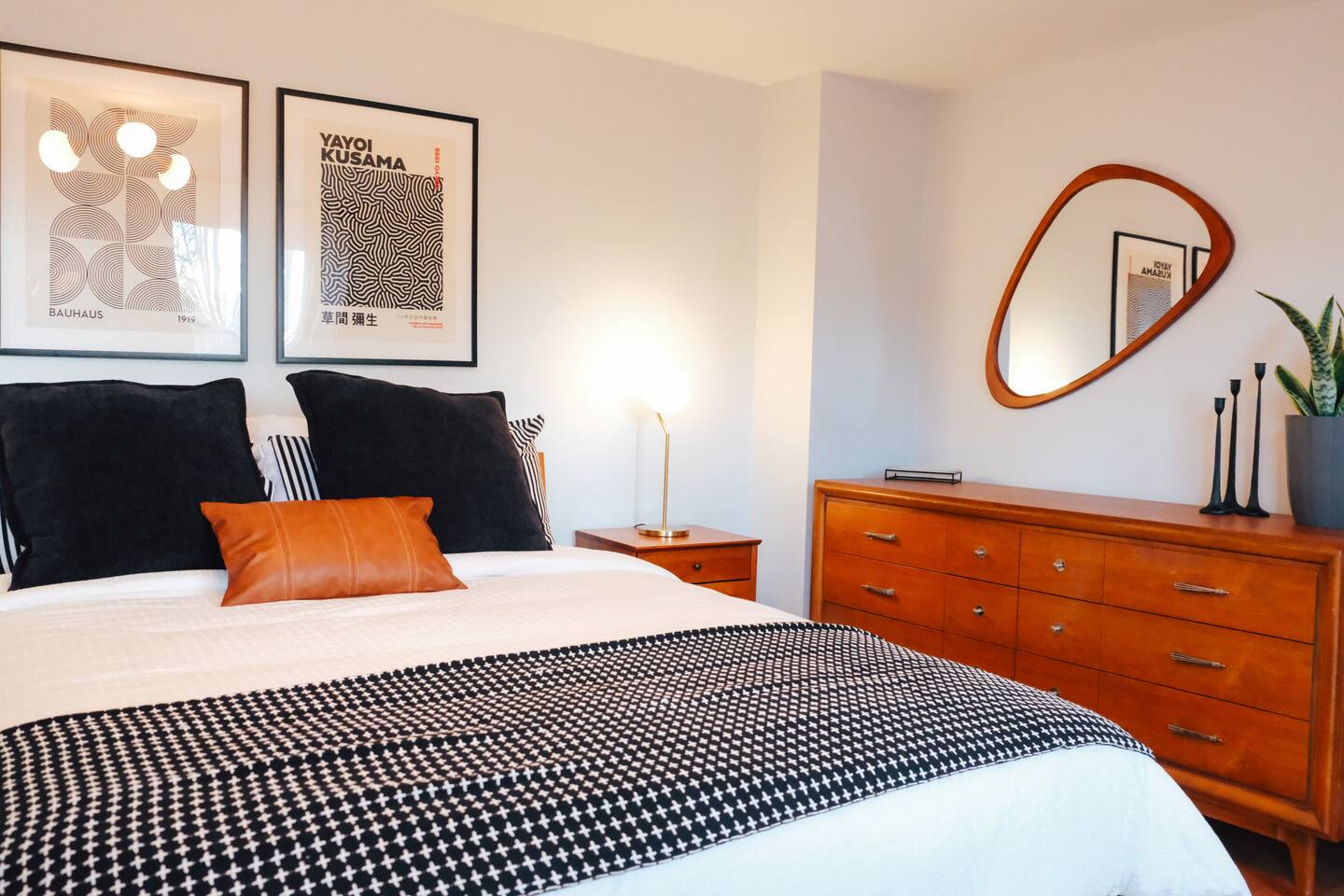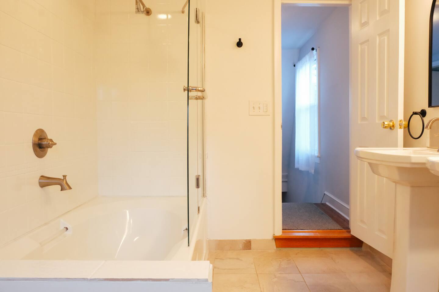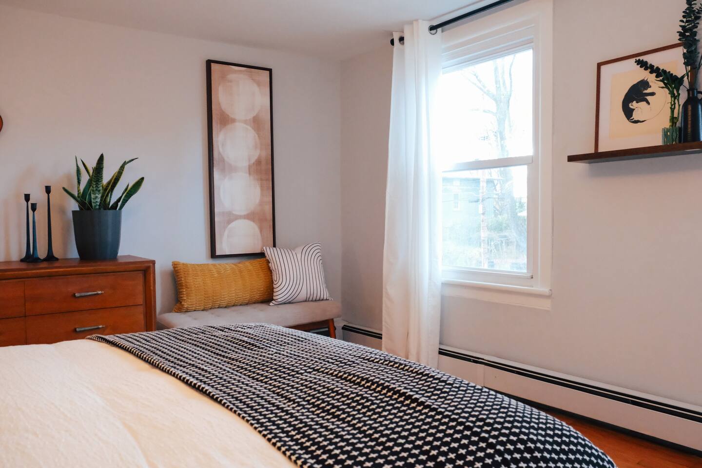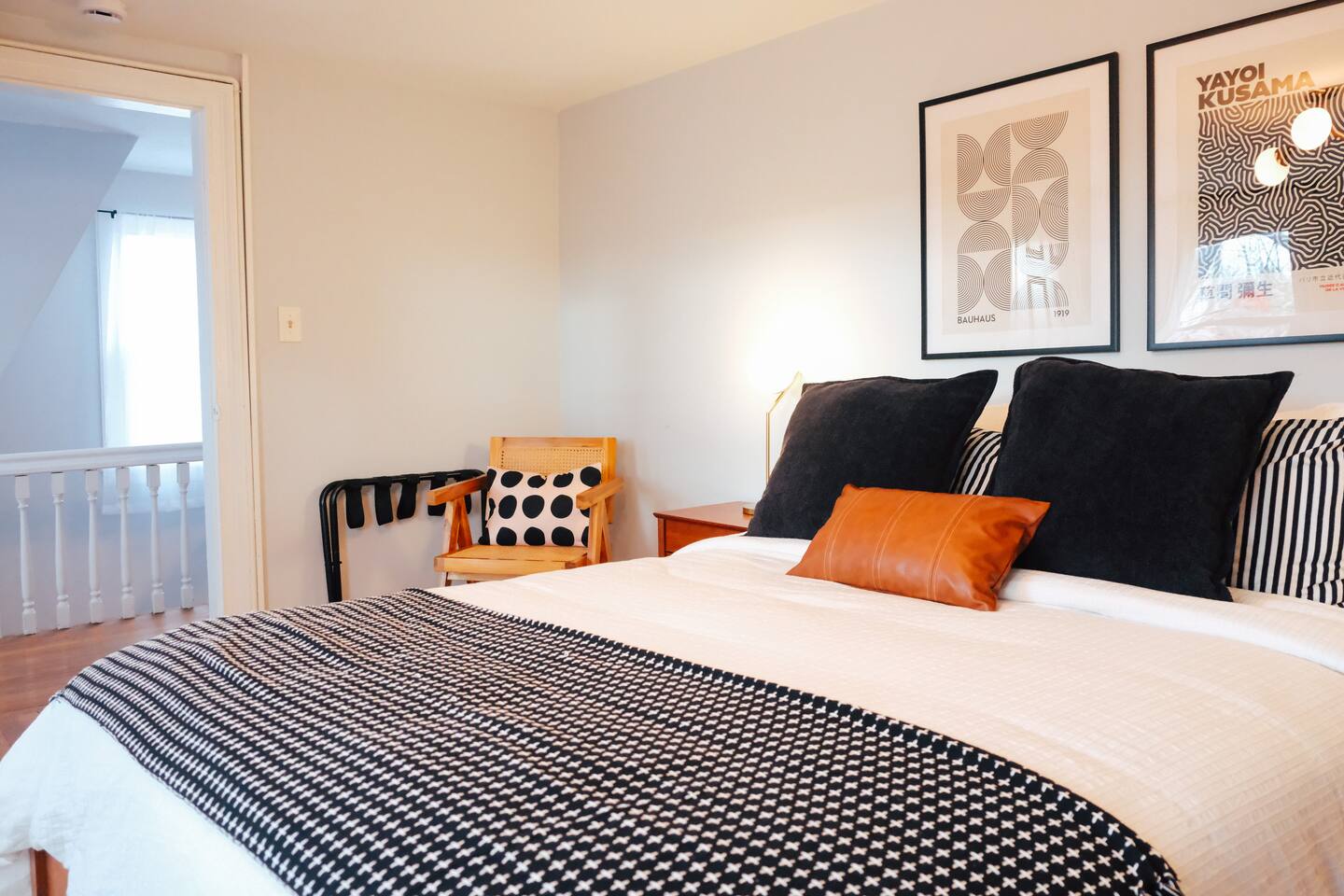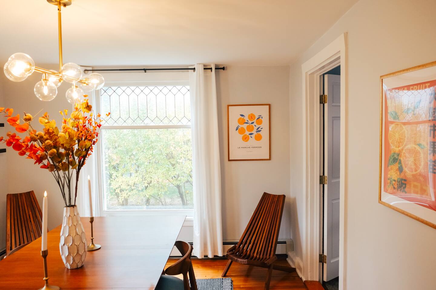 Your relaxing, rejuvenating escape awaits at this historic Saugerties village home blending timeless character with today's comforts and art-forward design. OUTSIDE • Deep, private yard • Patio with string lights • Solo wood-burning stove + lounge chairs • Off-street parking for 2 Cars • Front porch for sipping coffee • Next door to the public library LIVING ROOM • Stylish midcentury furnishings • Japanese-inspired art and design • Large windows with neighborhood view • Roku Smart TV 50-Inch Select Series • Playstation 5 game system • Vintage-style record player with bluetooth • Collection of Jazz records for enjoyment • Selection of books and games KITCHEN • Bright, light-filled kitchen • Workstations with room for a few chefs • Frigidaire Fridge/Freezer • Gas stove and oven combination • Dishwasher and microwave • Cooking pots, pans and utensils • Dishware, glassware, serving dishes • Drip coffee maker; chef's knives • Assorted tea and caffeinated coffee beans • Kosher salt, sugar, olive oil DINING ROOM • Light-filled with French doors to patio • MCM table with room for 8 • Danish-style wood lounge chairs • Adjacent to kitchen and living room BATHROOM 1 (First Floor) • Half bath located off kitchen BEDROOM 1 (Second Floor) • Queen-sized mattress • 100% cotton linens - 600 thread count • Closet and luggage rack • Spacious room with vaulted ceilings • Black and white decor accents • Tucked away in back corner of home BEDROOM 2 (Second Floor) • Queen-sized mattress • 100% cotton linens - 600 thread count • Closet and luggage rack • MCM dresser and design accents • Large windows with neighborhood view BEDROOM 3 (Second Floor) • The "kids' room" with bunk beds • 1 Full-size mattress (lower), 1 twin (upper) • 32" smart TV w/ Classic NES Nintendo console • Bean bag chair with view of yard • Small dresser • Books! BATHROOM 2 (Second Floor) • Large soaking tub • Standing shower • 100% Cotton Turkish towels and washcloths • Two vanities with pedestal sinks • Shampoo, conditioner, body wash • Stacked washer / dryer BEDROOM 4 / DEN / WORK STATION (First Floor) • Twin day bed for lounging or sleeping • Desk with view of the porch and neighborhood • Located off dining room We take cleaning very seriously and follow enhanced guidelines. The Village Farmhouse is a proud member of Canopy Collective, a premier co-hosting company.